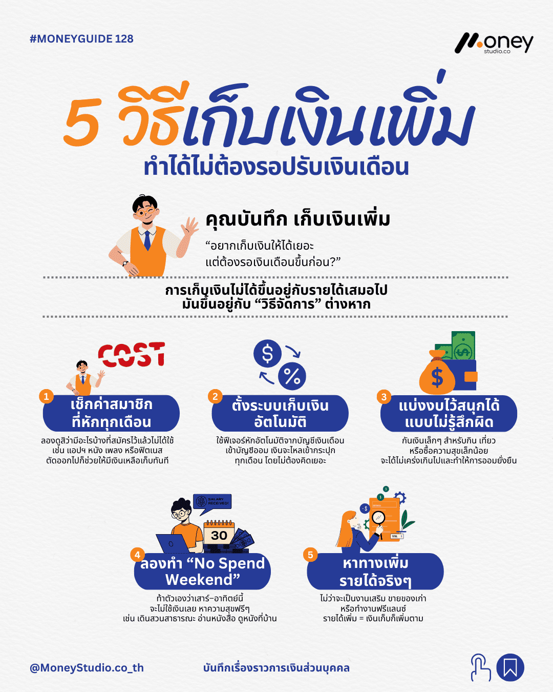 การเพิ่มเงินออมอย่างเป็นระบบสามารถเริ่มต้นได้จาก 5 แนวทางปฏิบัติที่เห็นผลลัพธ์ชัดเจนดังนี้: