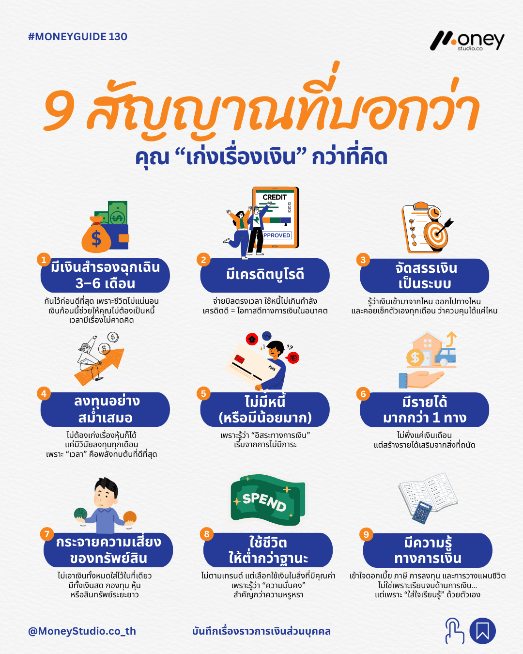 หลายคนมักเข้าใจผิดว่าการ “เก่งเรื่องเงิน” จะต้องวัดกันที่จำนวนตัวเลขในบัญชีหรือต้องมีเงินล้านเพียงอย่างเดียว แต่ในความเป็นจริง ความฉลาดทางการเงินเริ่มต้นจาก นิสัยทางการเงินที่ดี (Money Habits) และการวางรากฐานที่ถูกต้อง หากคุณมีสัญญาณครบทั้ง 9 ข้อนี้ ถือว่าคุณกำลังเดินอยู่บนเส้นทางที่ถูกต้องและเก่งเรื่องเงินกว่าที่ตัวเองคิดไว้มากครับ