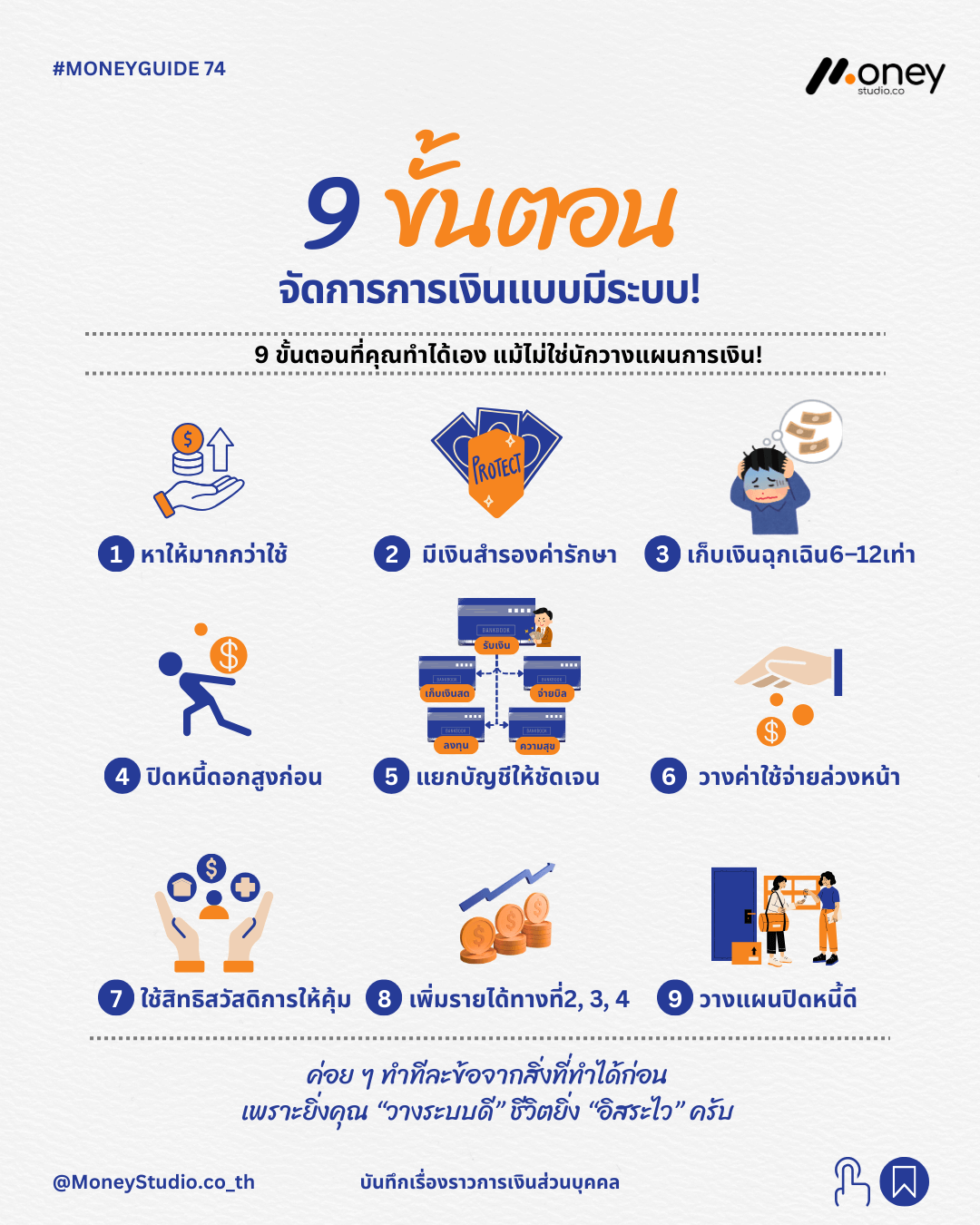 การมีสถานะทางการเงินที่ดีไม่ได้ขึ้นอยู่กับจำนวนรายได้เพียงอย่างเดียว แต่ขึ้นอยู่กับ “ระบบ” ในการบริหารจัดการเงินที่มีประสิทธิภาพ บทความนี้รวบรวม 9 ขั้นตอนสำคัญที่จะช่วยให้คุณจัดระเบียบการเงินได้ด้วยตนเอง เพื่อให้มีเงินพอใช้ มีเงินเก็บ และสามารถลงทุนต่อยอดได้อย่างมั่นคง