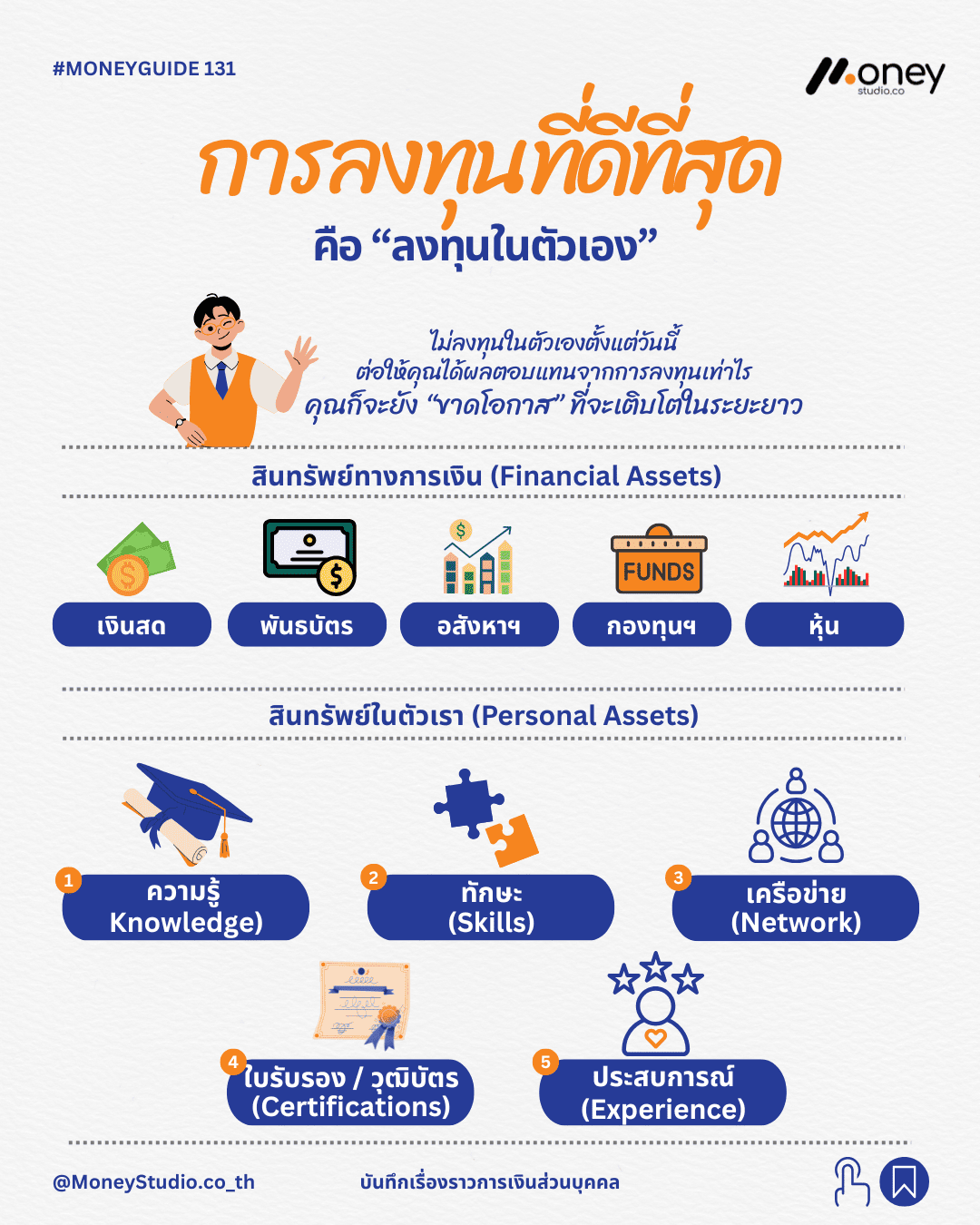 คำถามที่พบบ่อยที่สุดข้อหนึ่งคือ “ถ้ามีเงินก้อนควรลงทุนในอะไรดี? หุ้น กองทุน หรืออสังหาริมทรัพย์?” คำตอบที่ผมมักจะให้เสมอก็คือ “ลงทุนในตัวเองก่อนครับ” เพราะหากคุณไม่สร้างรากฐานจากภายใน ต่อให้ผลตอบแทนจากตลาดทุนจะสูงแค่ไหน คุณก็อาจขาดโอกาสที่จะเติบโตอย่างก้าวกระโดดในระยะยาว การสร้างสินทรัพย์ในตัวคุณเองจึงเป็นจุดเริ่มต้นของความมั่งคั่งที่แท้จริง