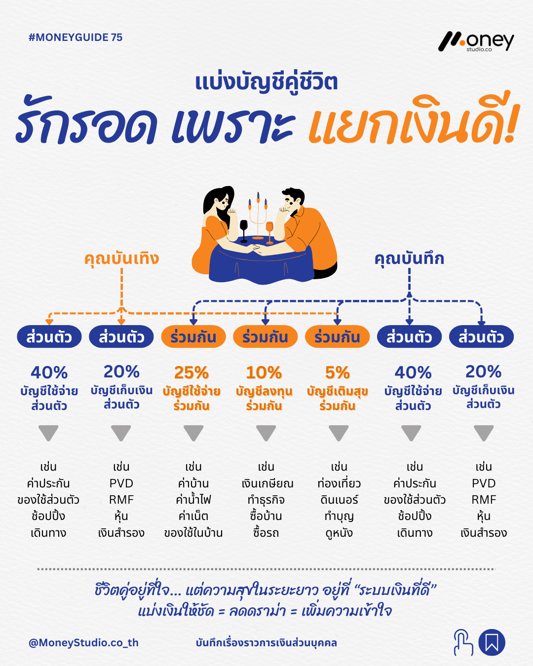 - 20 เปอร์เซ็นต์ – บัญชีเก็บเงินและลงทุนส่วนตัว: เช่น การส่งเงินสมทบกองทุนสำรองเลี้ยงชีพ (PVD) กองทุนรวม หรือเงินสำรองส่วนบุคคล เพื่อให้แต่ละฝ่ายมีการเตรียมความพร้อมสำหรับอนาคตของตนเอง
