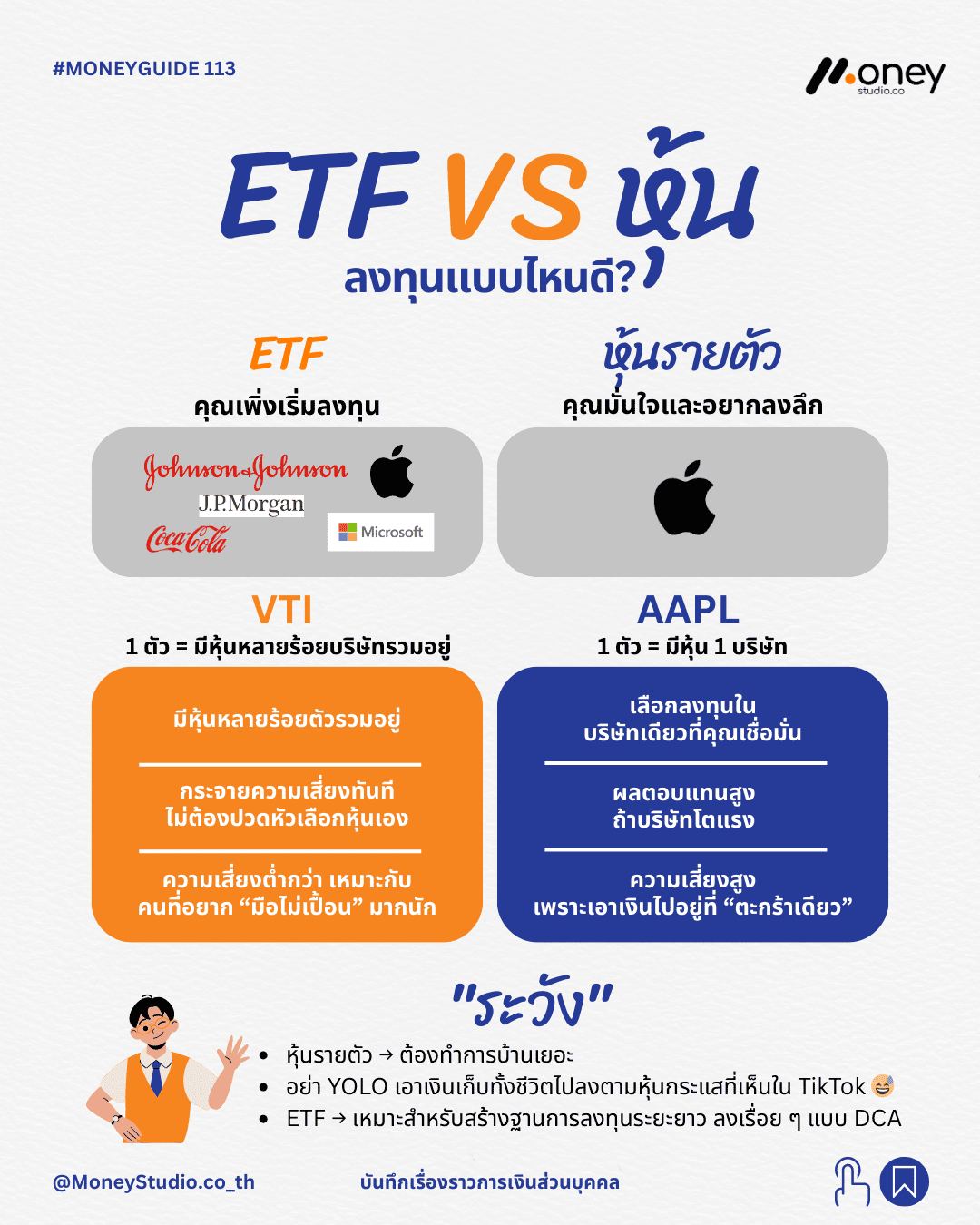 หนึ่งในคำถามที่พบบ่อยที่สุดสำหรับผู้ที่เริ่มต้นเข้าสู่โลกการลงทุนคือ “ควรเลือกลงทุนใน ETF หรือซื้อหุ้นรายตัวดีกว่ากัน?” ในความเป็นจริงไม่มีคำตอบที่ผิดหรือถูกแบบตายตัว แต่ขึ้นอยู่กับเป้าหมาย ความรู้ความเข้าใจ และความสามารถในการรับความเสี่ยงของแต่ละบุคคลเป็นสำคัญ
