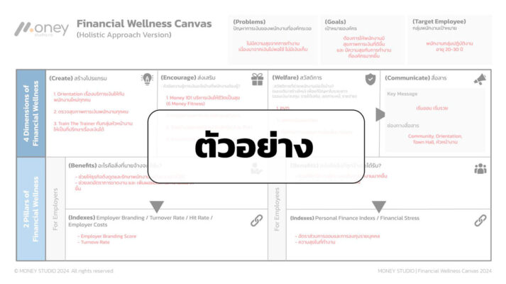 หมายเหตุ: Financial Wellness Canvas นี้ MoneyStudio.co จัดทำขึ้น เพื่อให้องค์กรสามารถเริ่มต้นวิเคราะห์ และวางแผนการสร้างสุขภาพการเงินที่ดีให้กับพนักงานภายในองค์กร ได้ด้วยตนเอง