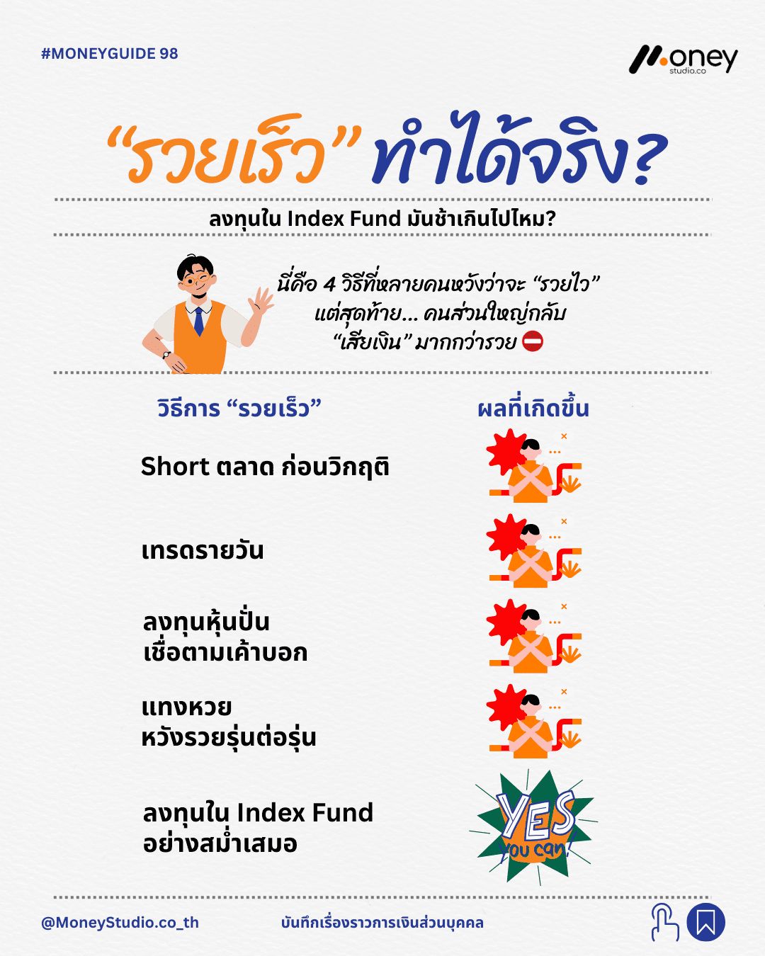 วิธีการที่เน้นความรวยเร็วเกินไปมักมาพร้อมกับความเสี่ยงที่ทำให้คุณเจ็บตัวเร็วเช่นกัน ในทางกลับกัน การลงทุนใน Index Fund อาจดูเป็นทางที่ช้า แต่เป็นหนทางที่พิสูจน์แล้วว่ามอบความมั่งคั่งที่แน่นอนและยั่งยืนให้กับผู้ที่มีวินัยมากพอ การเริ่มต้นตั้งแต่วันนี้ด้วยความเข้าใจที่ถูกต้อง คือก้าวที่สำคัญที่สุดของพนักงานออฟฟิศทุกคน