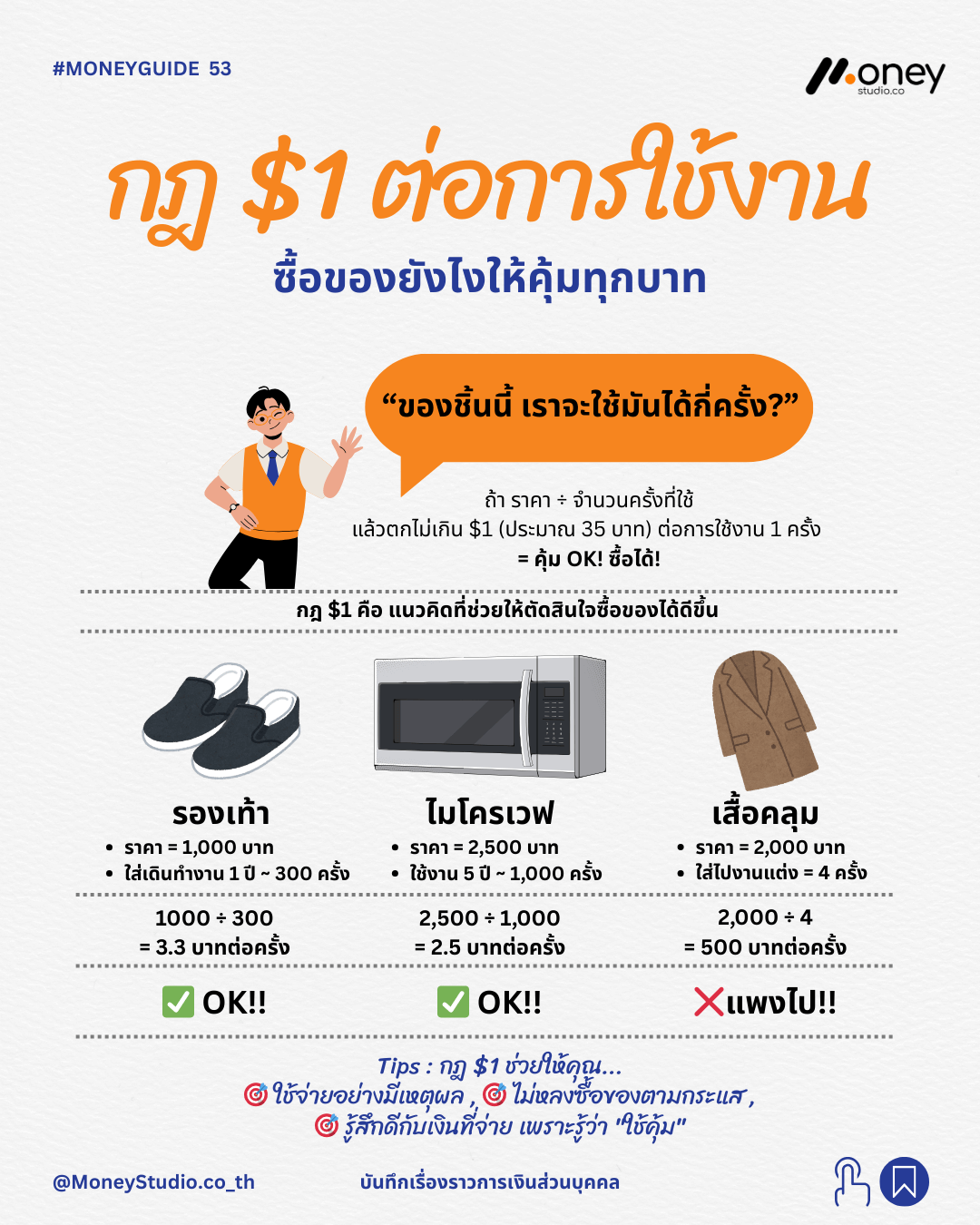 คุณเคยเป็นไหม? ซื้อของราคาหลักร้อยมาแต่กลับวางทิ้งไว้จนฝุ่นจับ หรือบางครั้งต้องยอมจ่ายหลักพันแต่กลับใช้งานทุกวันจนรู้สึกว่ากำไร Caroline “Joy” โค้ชการเงินชื่อดังได้เสนอแนวคิดที่จะช่วยแก้ปัญหานี้ที่เรียกว่า “$1 Rule” หรือ “กฎ 1 ดอลลาร์ต่อการใช้งาน” เพื่อเป็นเข็มทิศในการตัดสินใจว่าของสิ่งนั้นควรค่าแก่การควักเงินจ่ายหรือไม่