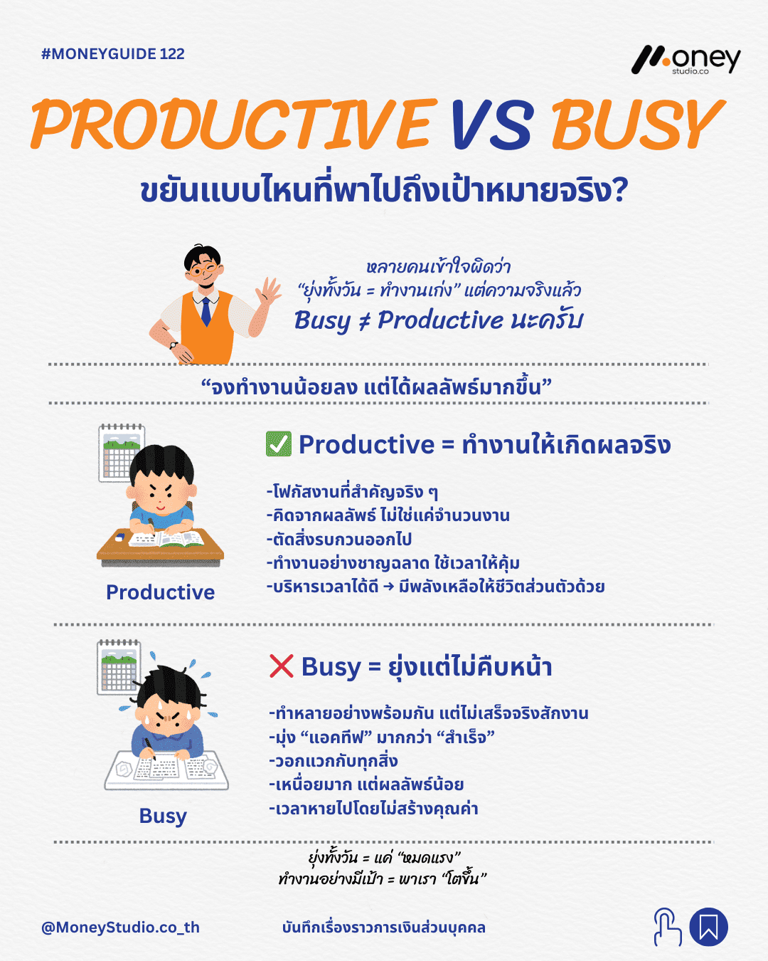 การยุ่งทั้งวันอาจทำให้คุณจบวันด้วยความ “หมดแรง” แต่การทำงานอย่างมีเป้าหมายและมีประสิทธิภาพจะพาคุณไปสู่การ “เติบโต” ทั้งในหน้าที่การงานและการเงิน จำไว้ว่าเป้าหมายไม่ใช่การทำงานให้หนักที่สุด แต่คือการทำงานให้ฉลาดที่สุดเพื่อสร้างอิสรภาพให้กับชีวิตของคุณเอง