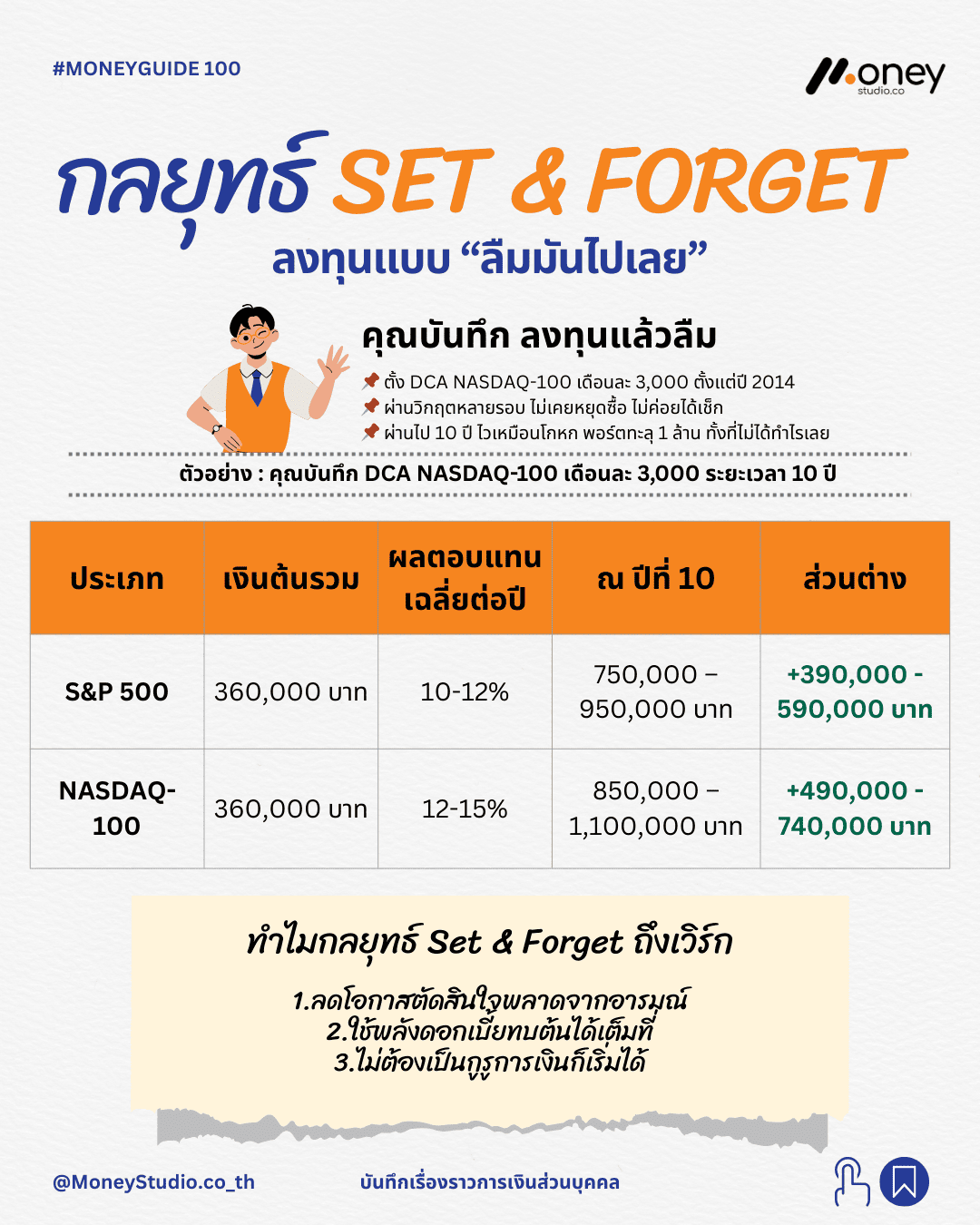 กลยุทธ์ Set & Forget ไม่ใช่เครื่องมือสำหรับการสร้างความมั่งคั่งเพียงข้ามคืน แต่เป็นระบบที่ช่วยให้พนักงานออฟฟิศสามารถสร้างความมั่นคงทางการเงินได้อย่างสม่ำเสมอและยั่งยืน เหมาะสำหรับผู้ที่มีเป้าหมายชัดเจนแต่ต้องการใช้เวลาที่มีไปกับการดำเนินชีวิตและการทำงานอย่างเต็มที่ การเริ่มต้นตั้งค่าระบบในวันนี้ คือก้าวแรกที่สำคัญที่สุดในการให้เงินทำงานแทนคุณในอนาคต