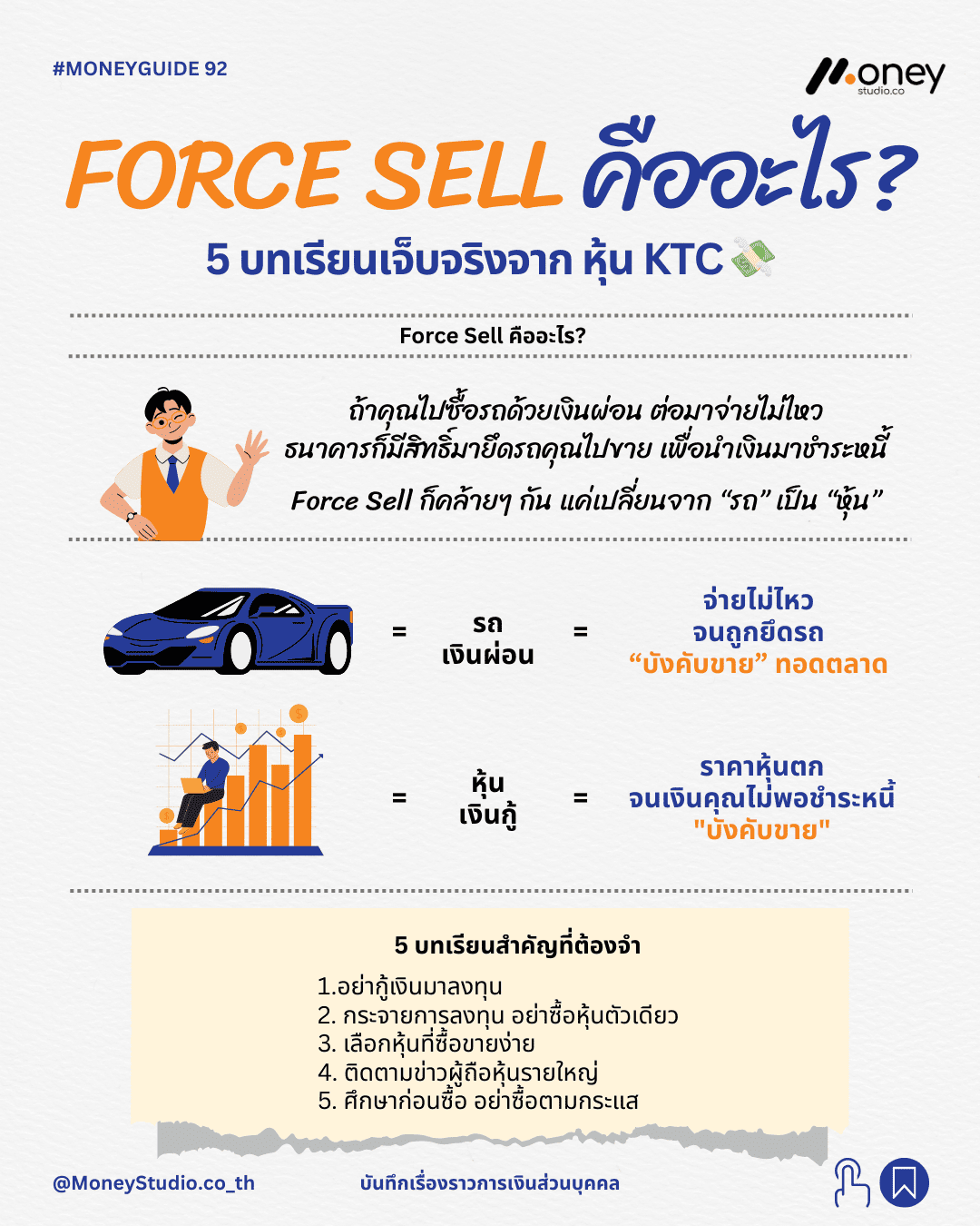 - เหตุการณ์ที่เกิดขึ้น: มีนักลงทุนรายใหญ่ใช้หุ้น KTC จำนวนมากเป็นหลักประกันเพื่อกู้ยืมเงิน เมื่อภาพรวมตลาดหุ้นผันผวนจนทำให้มูลค่าหลักประกันลดลงและไม่สามารถเติมเงินได้ทัน บริษัทหลักทรัพย์จึงจำเป็นต้องทำ Force Sell หุ้น KTC ออกมาในปริมาณมหาศาล ส่งผลให้ราคาทรุดตัวลงอย่างรวดเร็วและกระทบต่อนักลงทุนรายย่อยที่ถือหุ้นตัวเดียวกัน