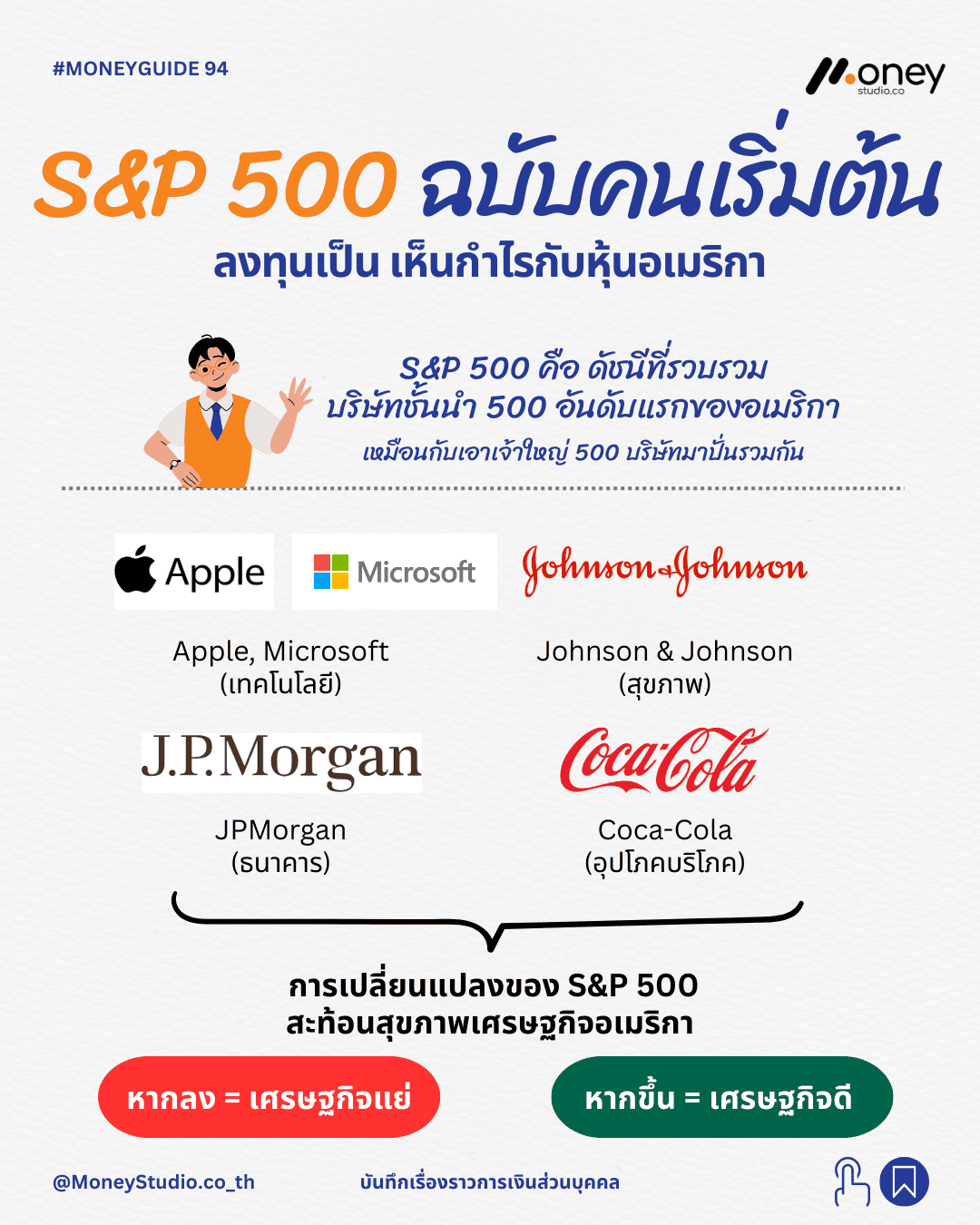 S&P 500 คือดัชนีราคาหุ้นที่รวบรวมบริษัทมหาชนที่มีมูลค่าตลาดสูงสุด 500 อันดับแรกในสหรัฐอเมริกา ซึ่งครอบคลุมหลากหลายอุตสาหกรรม โดยมีบริษัทชื่อดังที่เป็นส่วนประกอบหลัก เช่น Apple, Microsoft, Amazon, Johnson & Johnson และ Coca-Cola